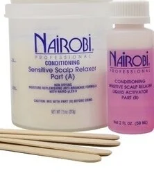 Nairobi sensitive scalp relaxer system. Liquid activator 4 wooden spatulas and instructions. Nairobi Professional has many products available to style condition or protect your hair. Nairobi Conditioning Sensitive Scalp Hair Relaxer Kit This nairobi conditioning sensitive scalp hair relaxer kit is a 4 pack system that includes 4 full applications or 8 single touch-up applications.