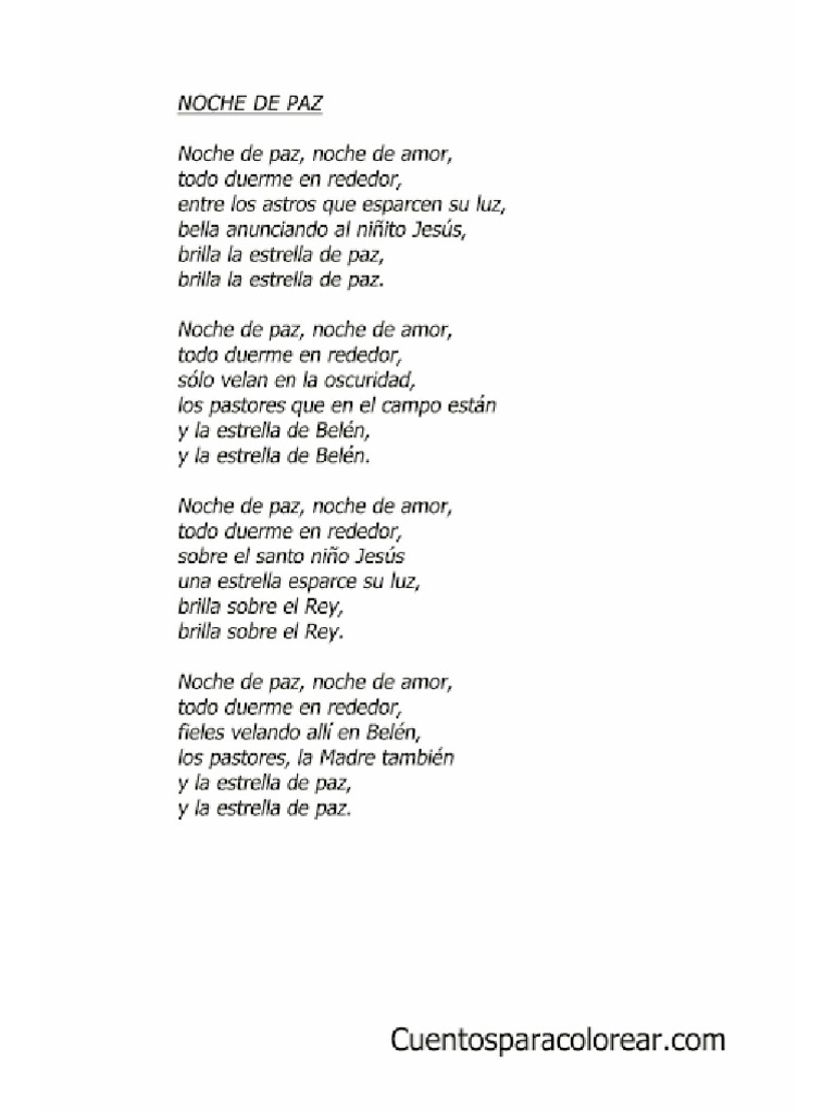 Noche de paz noche de amor todo canta en derredor. Noche de paz Noche de amor Todo duerme alrededor Ni los ángeles quieren cantar Para no despertar al Señor Todo es paz en la oscuridad Hoy ha nacido el amor. Brilla la estrella de paz.